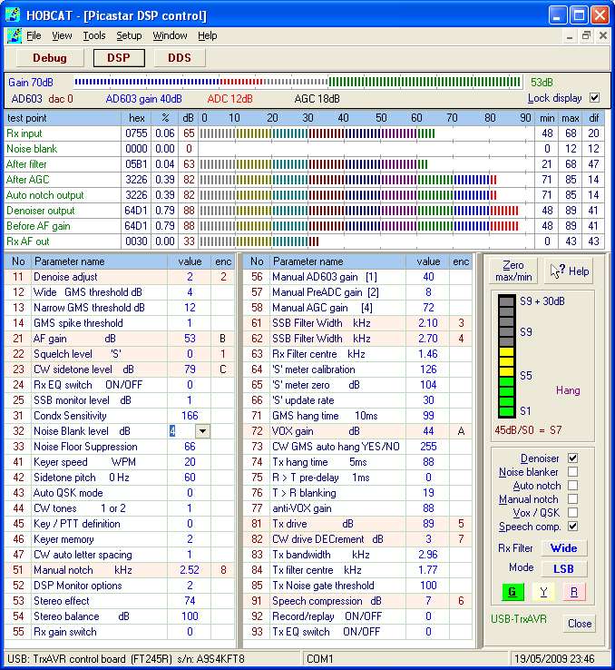 I was able to confirm the correct operating of this DSP display by running Hobcat's DSP display (via USB) and G3XJP's DSP monitor display (via RS232) alongside each other in the PC screen.