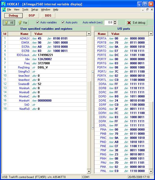 - Debug: This provides via USB background monitoring ofTxrAVR's Atmega2560 ports and selected internal variables.