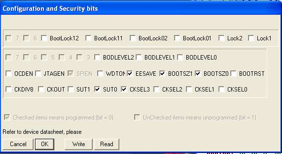 - Set the check-boxes as shown above and then click Write to send these settings to the ATmega2560.