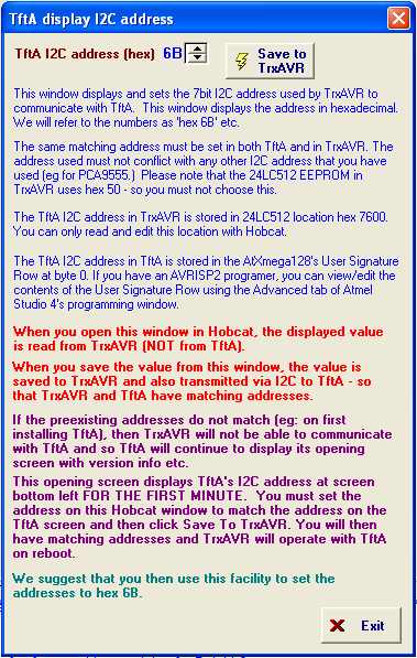 Hobcat's Setup Menu now contains an item : TftA I2C address which displays the window below: